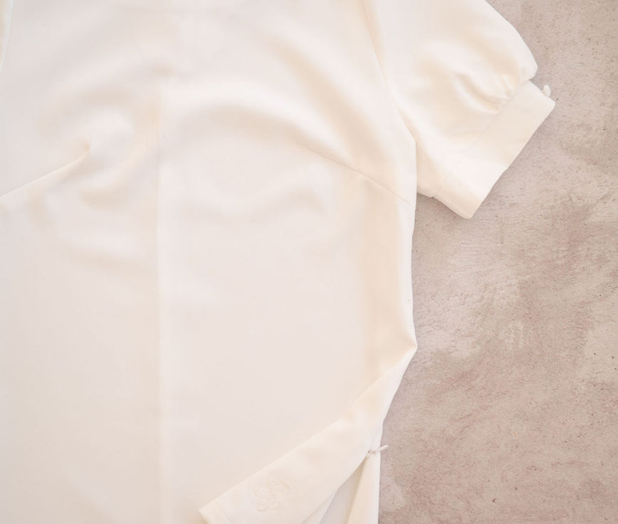 This top is romantic yet refined, with its puff sleeve and small button detail on the elastic cuff. The best feature of this top is its versatility regarding whether you want it to be fully tucked-in, worn out or halfway tucked-in. It has hidden zippers on either side that can be opened and allow you to tuck only the front part in.